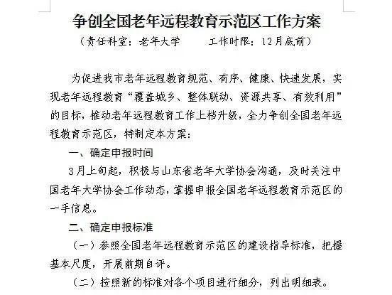 严格按照上级老干部工作部门要求,围绕离退休干部政治引领、信息化建设、发挥作用等内容,制定《乳山市2020年老干部重点工作实施方案》,方案明确了工作开展的主要措施、完成时限等内容,确保工作落实有条不紊,渐次推进。结合乳山实际,今年共确定了争创全国老年远程教育示范区、打造离退休干部党建工作示范点、开展“助力脱贫·圆梦小康”志愿服务活动等20项重点工作任务。