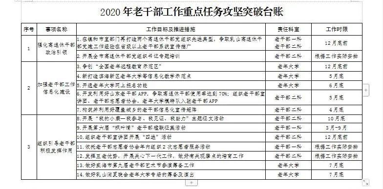 为认真贯彻落实“重点工作攻坚突破年”要求,乳山市突出2020年老干部工作重点任务和关键环节,制定时间表、路线图,把工作任务具体到项目、落实到岗位、量化到个人,集中精力抓落实,切实推动各项重点工作往深里抓往实里走。