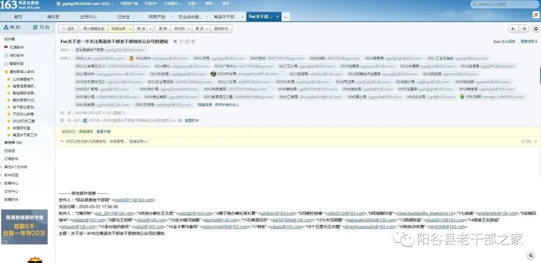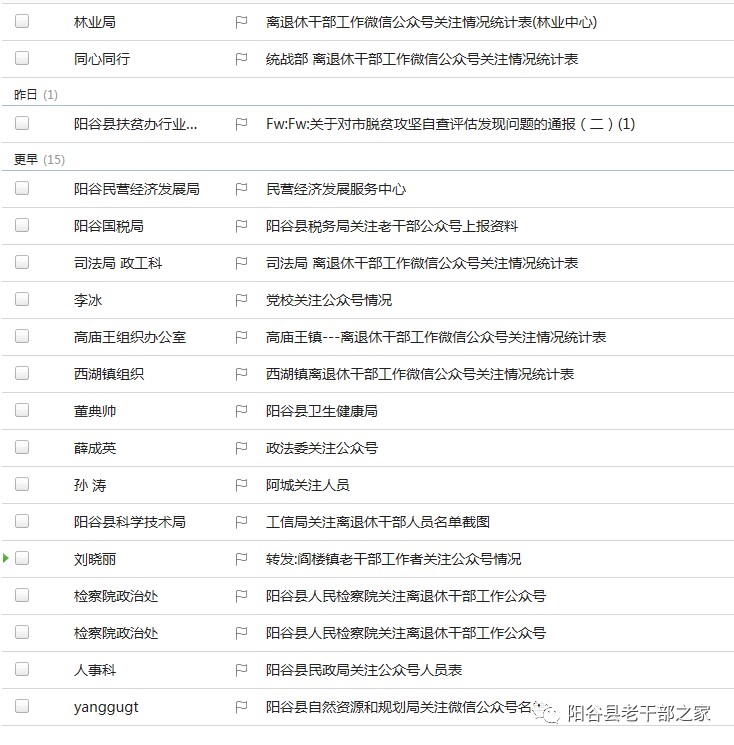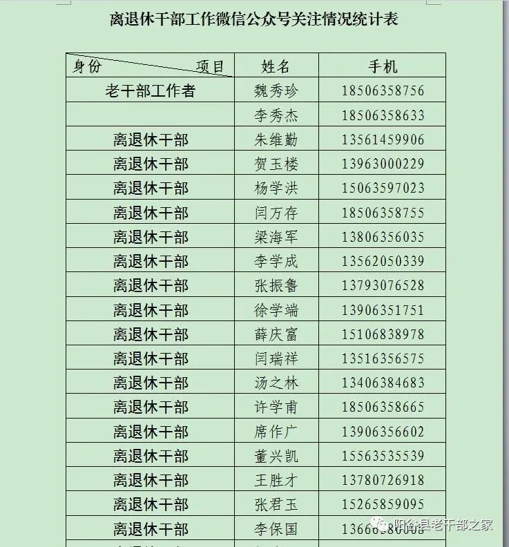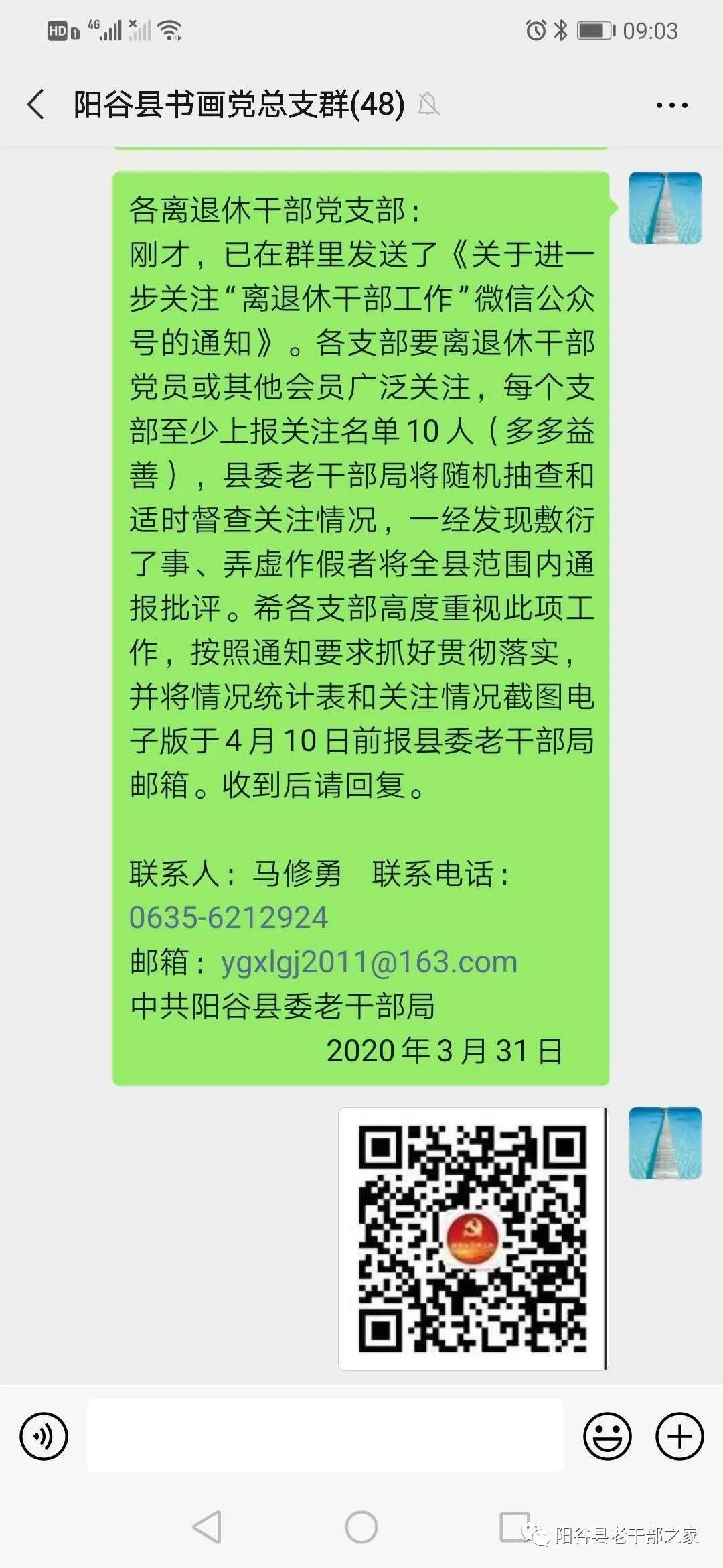 第一时间传达。3月31日,在“山东老干部”微信公众号平台发布《关于进一步组织广大老同志关注并用好“离退休干部工作”微信公众号的通知》当天,阳谷县委老干部局专门下发通知,依托“阳谷老干部之家”微信公众号平台发布,强调关注学习“离退休干部工作”微信公众号的重要性,要求全县各乡镇(街道)组织办、县直单位老干部(政工、人事)科、离退休干部党组织认真发动老干部工作者和离退休老干部广泛关注,同时设计了《离退休干部工作微信公众号关注情况统计表》,要求各乡镇(街道)和县直单位4月10日前上报已关注公众号的离退休干部名单、电话及截图,县委老干部局将加强督导检查,电话随机抽查,并将关注和浏览“离退休干部工作”微信公众号情况纳入老干部工作年度考核的一项内容。