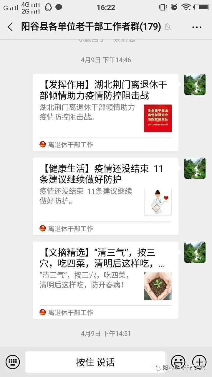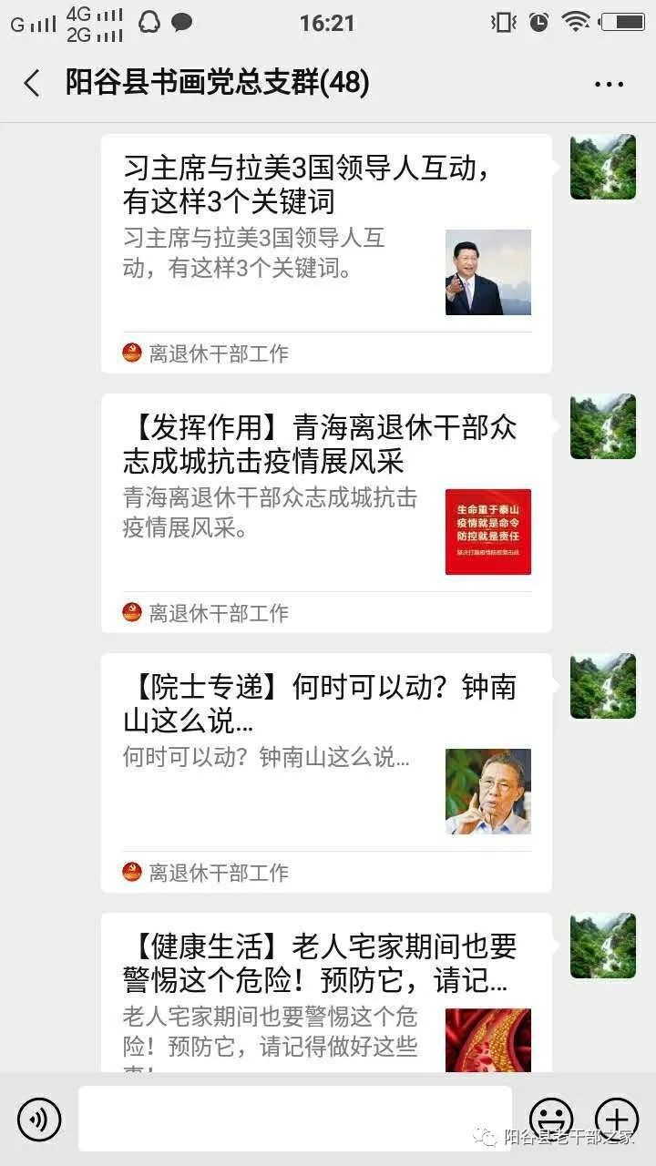 学习蔚然成风。县委老干部局安排专人负责每天在“阳谷县各单位老干部工作者”“阳谷县离退休干部党总支”“阳谷县老年大学”等微信交流群转发“离退休干部工作”微信公众号刊载的重要言论和信息文章,及时向关注者推送,方便浏览学习。广大离退休干部通过微信公众号平台,及时了解习近平总书记重要指示精神和其他省市老干部工作动态,陶冶了情操,丰富了健康知识。阳谷县老年社团离退休干部党总支书记李奇说:“自从关注了公众号,每天我都能看到学习习近平总书记重要讲话和重要指示精神,进一步增强了‘四个意识’,坚定了‘四个自信’,提高了政治素质。”县农业综合服务中心退休干部程学信家属说:“微信公众号每天都刊登生活保健健康知识,浏览学习使我和老伴的身体越来越健康,为我们的晚年幸福生活提供了强有力的保障。”