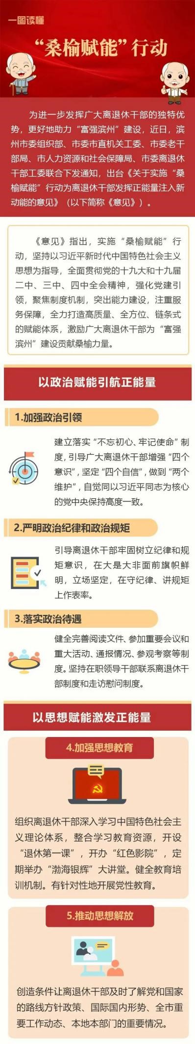 近年来,全省老干部工作部门围绕新时代现代化强省建设,出台制定了一系列务实管用的制度规定,组织引领全省广大离退休干部开展形式多样的活动,为党和人民的事业增添正能量。近日,滨州市出台《意见》,实施“桑榆赋能”行动,为离退休干部发挥正能量注入新动能。现将有关情况予以转发,供各级各部门学习交流。