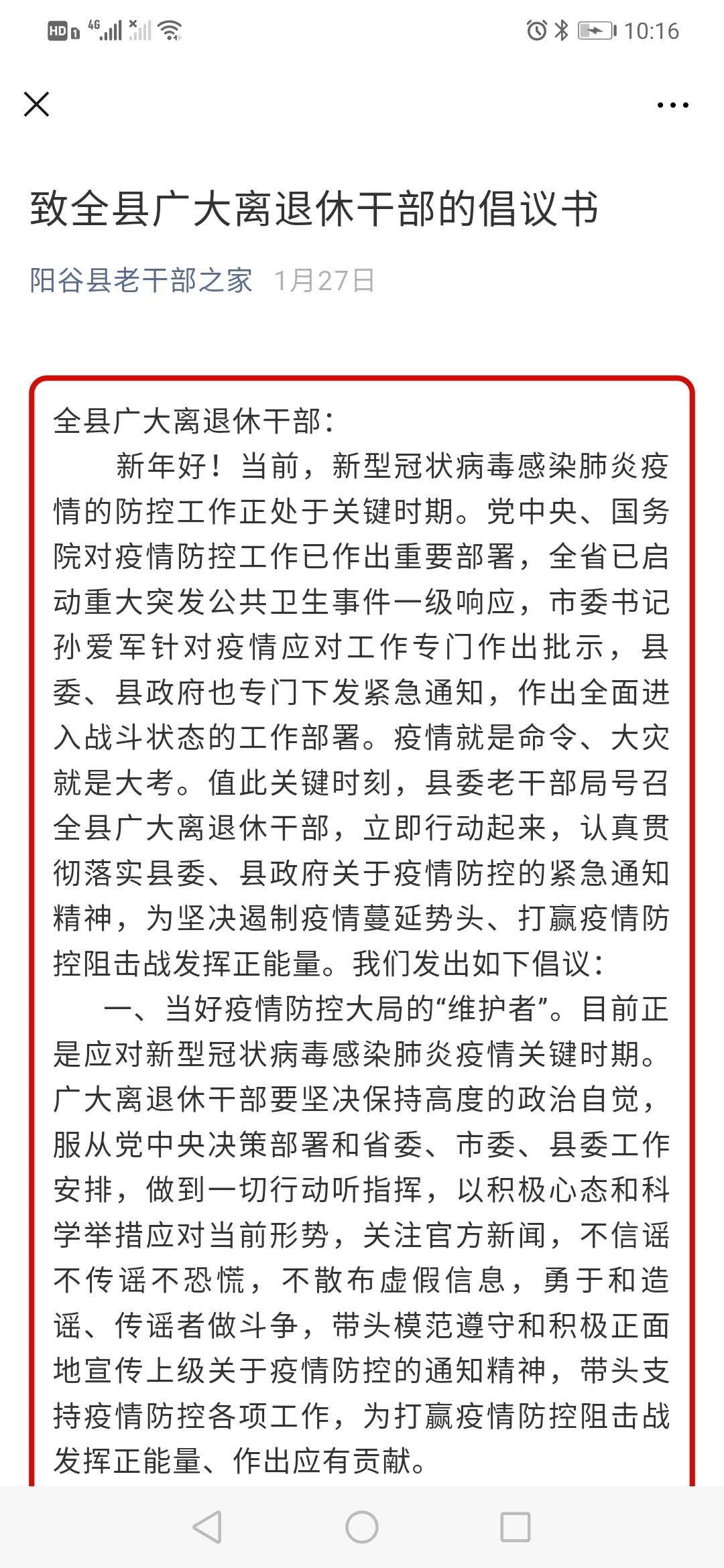 新冠肺炎疫情发生以来,阳谷县委老干部局牢固树立以老干部为中心的工作思想,切实提高政治站位,强化责任担当,在坚决打赢疫情防控阻击战的同时,采取多项措施,扎实做好离退休干部亲情化服务工作,努力做到让组织放心、让老干部满意。