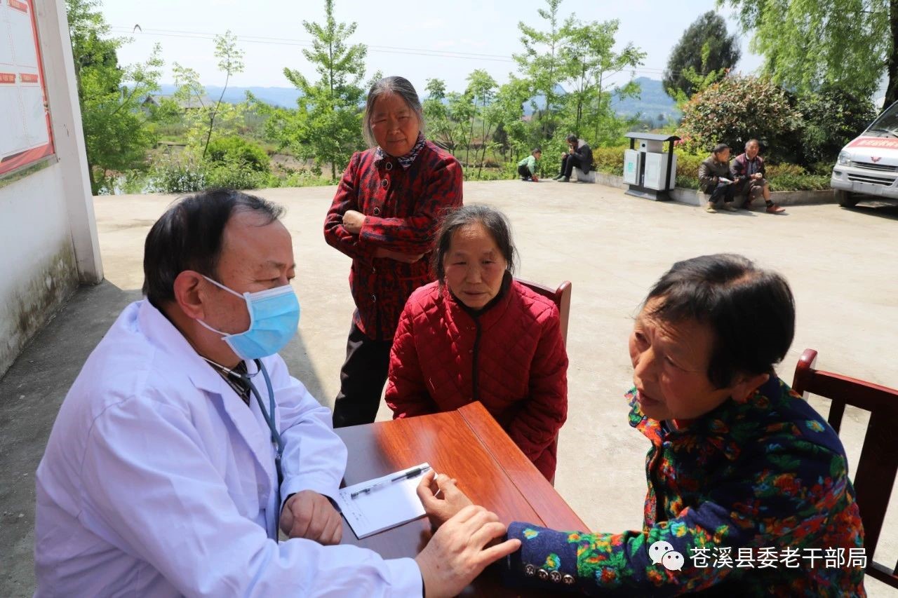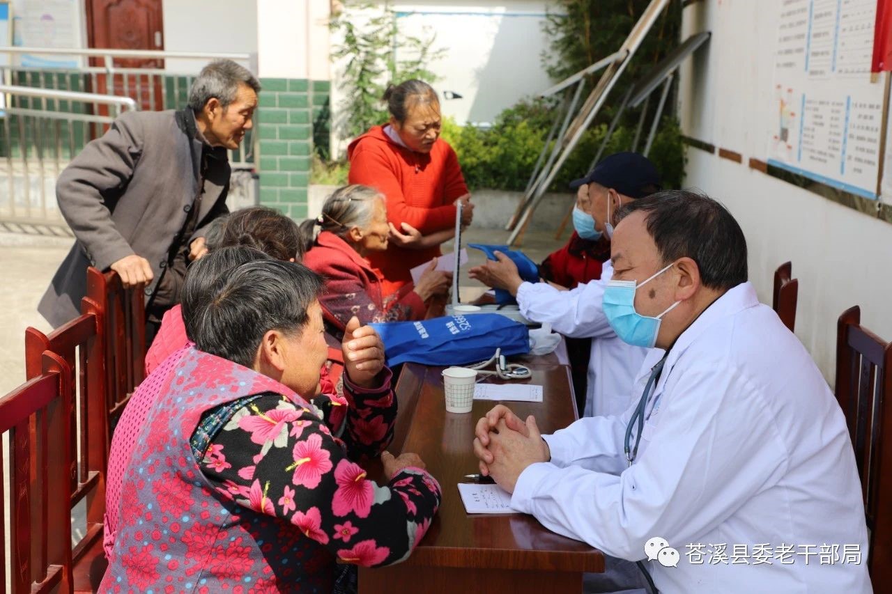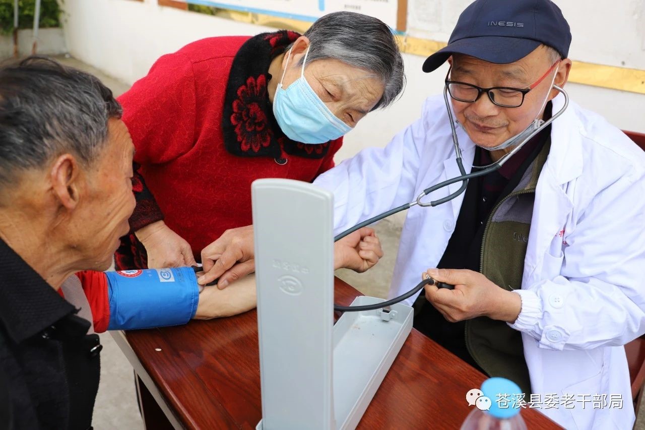 图为:离退休老干部开展义诊活动,细心为群众治病。
