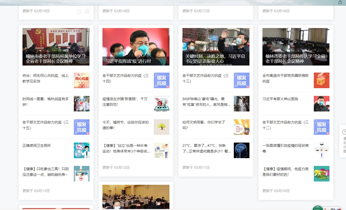 老骥伏枥知未晚,塞上桑榆正当红。在这场突如其来的战“疫”中,老干部们不忘初心、牢记使命,发挥自身优势和示范带头作用,充分展示了退休不褪色,离岗不离党的共产党员本色,用实际行动诠释了“苍松岁久色愈新”的新时代榆林老干部风采!
