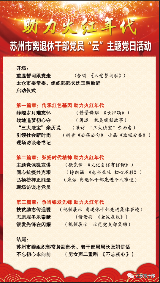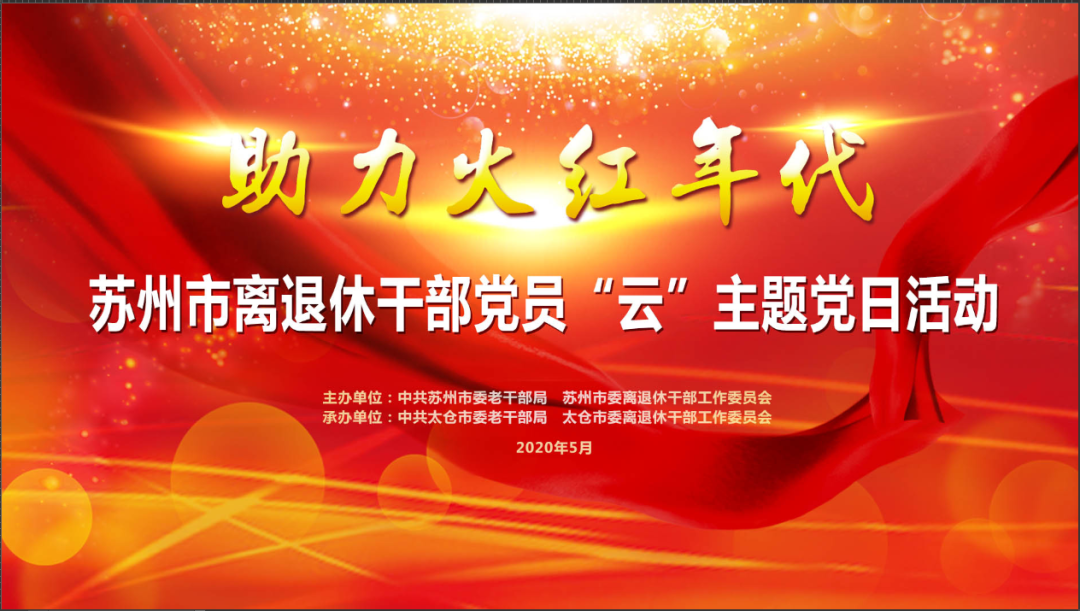 为认真贯彻省委老干部局、省委离退休干部工委《关于在全省离退休干部党组织中开展“畅谈奔小康,助推双胜利”主题党日的通知》精神,苏州市委老干部局、市委离退休干部工委迅速响应、积极行动,定于5月8日下午2点,开展“助力火红年代”苏州市离退休干部党员“云”主题党日活动示范观摩会,组织引导全市离退休干部党员 “讲好三个故事、弘扬三种精神、助推三大任务”,为激情燃烧的火红年代添火助力。