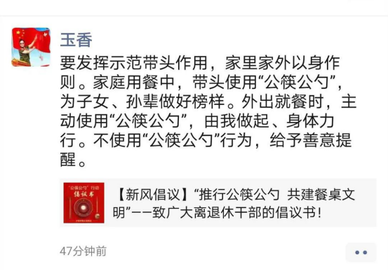 劳动节,与文明同步。劳有所获,心有所向。在享受劳动成果时,老同志们不忘初心,积极响应全市“文明就餐、从我做起”的倡议,身体力行用自己的方式倡导公筷公勺行动,积极参与巡河和环保志愿活动,力所能及地当好文明风尚的宣传员和践行者。