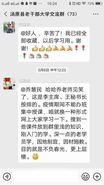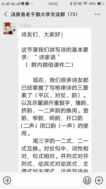 5月11日,汤原县老干部大学诗词班正式开课,开课前老师带领学员们开展“课前十分钟”原文朗读活动,认真学习习近平新时代中国特色社会主义思想第一讲,引导学员们坚定理想信念、筑牢思想根基,并针对诗词写作的基本要求进行具体讲解。通过“微信群+”线上教学,让老年学员紧跟时代步伐,享受到了“互联网+”带来的便利,解决了不能集中活动,不能开展学习的问题,受到学员们的一致好评。