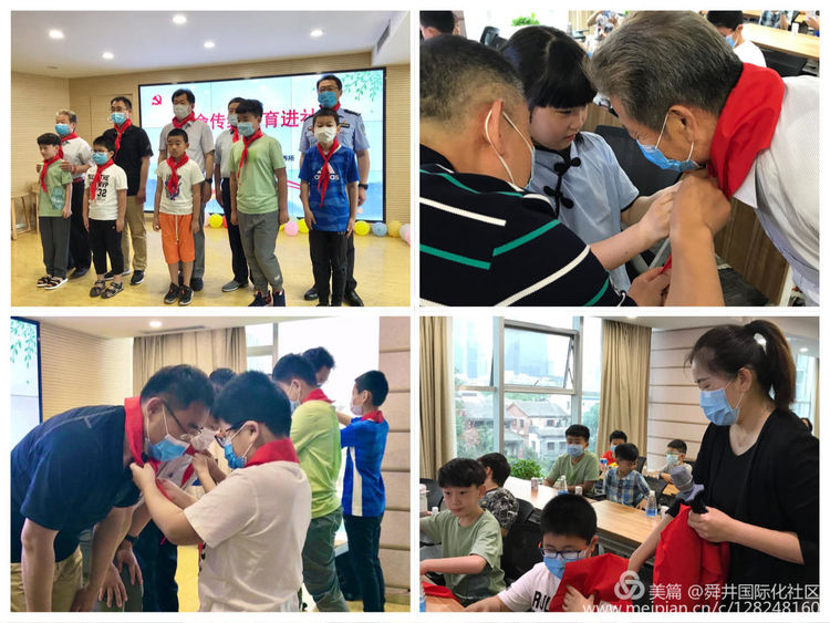 社区少年儿童代表为参加本次活动的省政协关工委成员系上鲜艳的红领巾。鲜艳的红领巾连结了老少两代,将“红色”基因、“红色”文化代代相传。