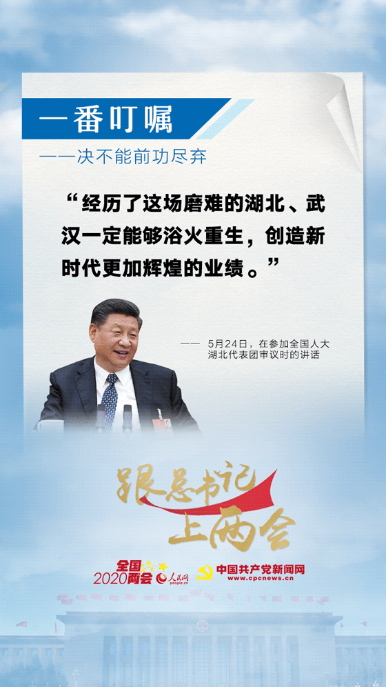5月24日,面对湖北代表团的代表们,他又一次强调:“武汉不愧为英雄的城市,湖北人民和武汉人民不愧为英雄的人民。我向在座各位、向湖北各族干部群众致以诚挚的问候和衷心的感谢。”