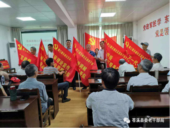 “退休干部正能量工作室”主任为志愿服务队授旗。