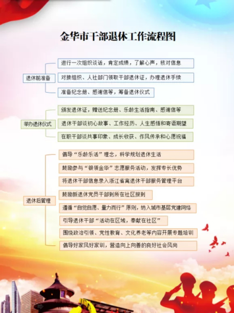 主要内容:一、进行一次组织谈话。与拟退休干部进行一次专题谈话,肯定成绩,了解心声,听取意见建议,对下步过好组织生活、严守党纪国法、永葆党员先进性提出希望和要求。二、举办一场退休仪式。遵循简约温馨庄重原则,通过颁发退休证,赠送纪念册、乐龄生活指南、感谢信等,体现组织对干部的尊重肯定、关心关爱。三、组织一次座谈交流。举办新退休干部与在职干部、年轻干部座谈会,开展信仰对话,让退休干部谈初心故事、工作经历、人生感悟和寄语期望,让在职干部谈共事印象、成长收获、作风传承和心愿祝福等。四、安排一次管理对接。向新退休干部讲解各项退休政策待遇、组织活动安排、有关纪律规定,告知老年大学课程等有关信息,倡导“乐龄乐活”理念。鼓励退休干部根据兴趣爱好,积极参与“银领金华”志愿服务活动,发挥专长优势。五、推动一次社区对接。鼓励新退休党员干部到所在社区报到。按照遵循“自觉自愿、量力而行”原则,纳入城市基层党建网络,参与社会治理和各类公益活动,引导退休干部“活动在区域,奉献在社区”。六、组织一次专题培训。适时组织开展专题培训,引导和帮助新退休干部更新知识、促进身心健康、传承好家训好家风,带头营造文明向上、崇德向善的良好社会风尚。