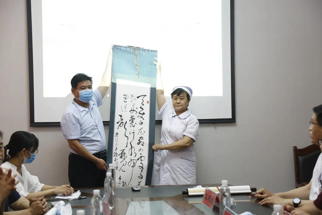 市红十字会常务副会长薛淑清, 市委老干部局副局长、市老年大学校长陈智勇,向乐陵市人民医院呼吸科副主任、援鄂英雄赵建厂捐赠书画精品。