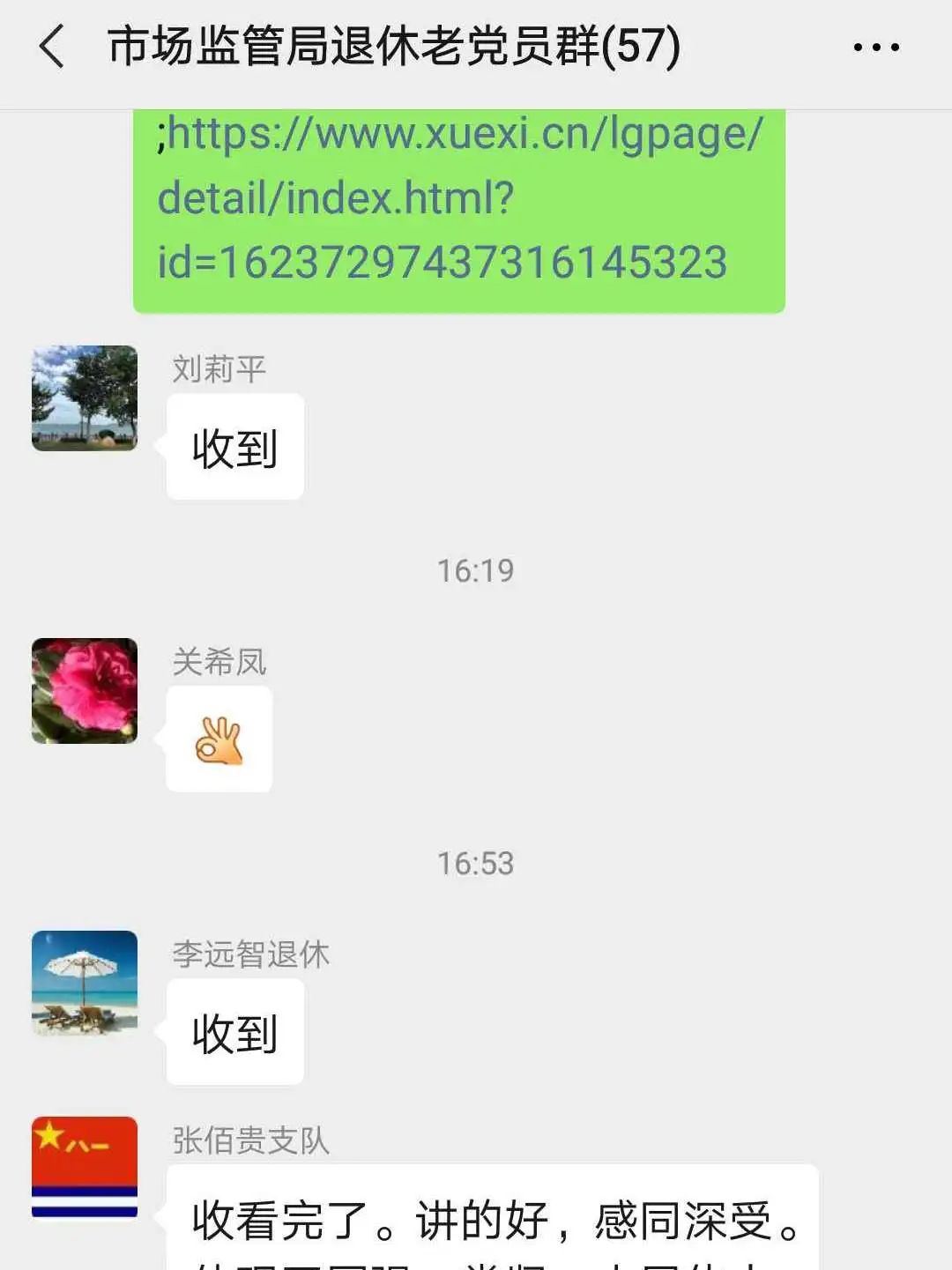 二是开展线上学习。疫情防控期间,为避免人员聚集,创新学习方式,建立了“市场监管局离退休干部微信群”,通过组织离退休干部开展线上学习,坚定其抗疫信心,鼓励其积极传播抗疫正能量。