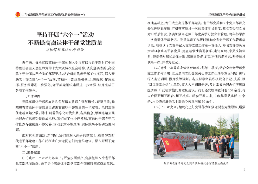 近些年来,在中央组织部老干部局的精心指导下,在山东省委的正确领导和省委组织部的关心指导下,山东省各级离退休干部工作部门坚持以习近平新时代中国特色社会主义思想为指导,深入学习贯彻习近平总书记关于老干部工作的重要论述,认真贯彻落实中办发〔2016〕3号和鲁办发〔2016〕37号文件精神,以提升组织力为重点,以打造“本色家园”品牌为载体,秉持开放融合共享理念,勇于开拓创新,形成了一系列可学习、可借鉴、可推广的好经验好做法。山东省委老干部局、省离退休干部党工委在广泛征集离退休干部党建工作创新案例的基础上,编印了《山东省离退休干部党建工作创新优秀案例选编(一)》。