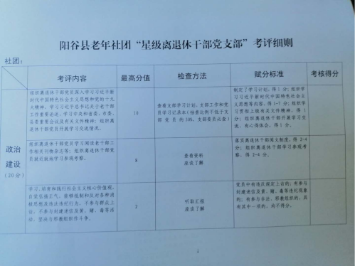 为认真贯彻落实好山东省委老干部局《关于深入推进“本色家园”离退休干部党支部建设工作的通知》精神,结合全市老干部工作会议推广“星级离退休干部党支部”创建活动部署,聊城市阳谷县制定了全县老年社团“星级支部”创建标准,作出了6月份在全县老年社团推广实施“星级支部”创建活动的决定。目前,创建活动持续推进中。