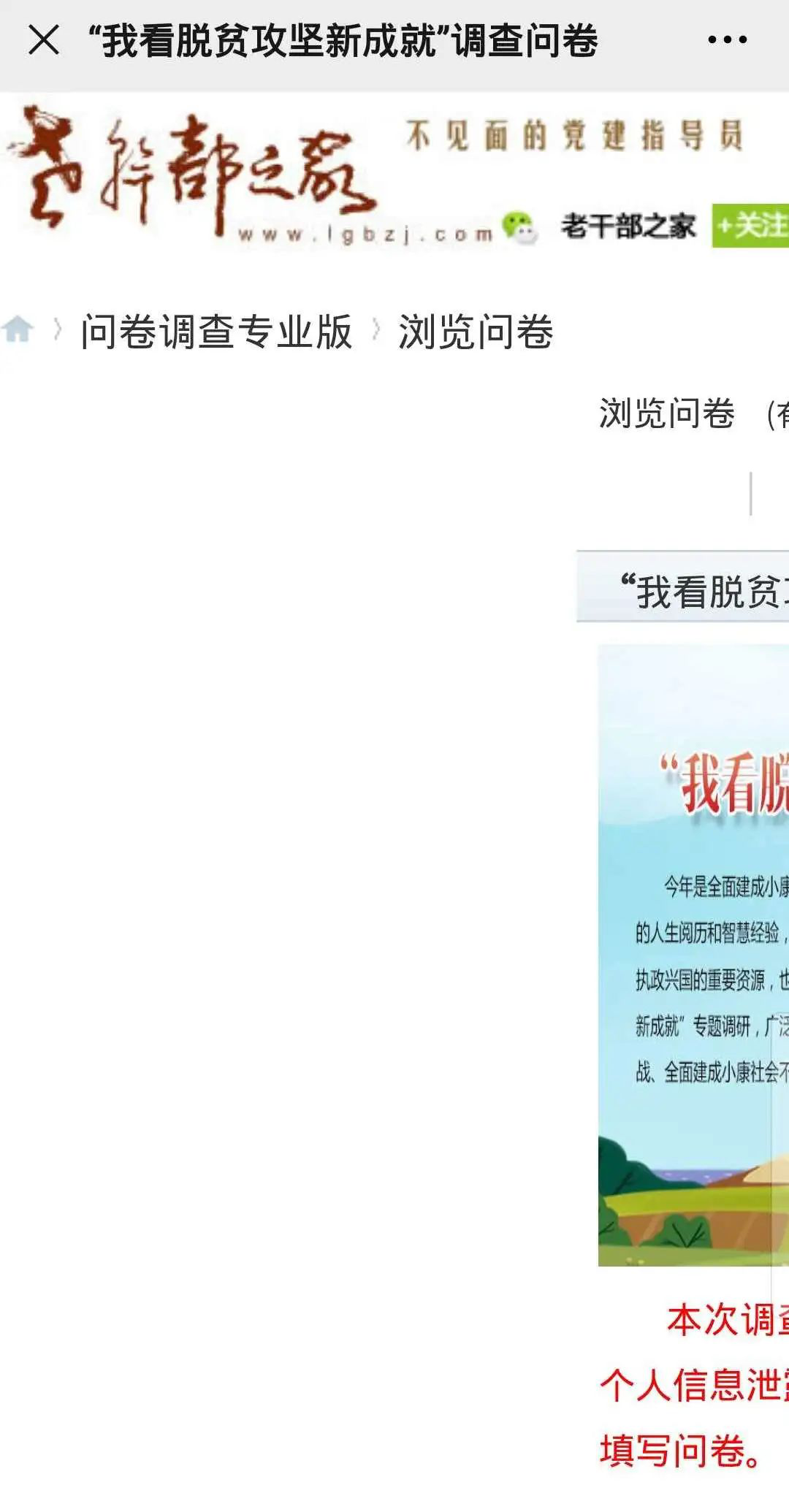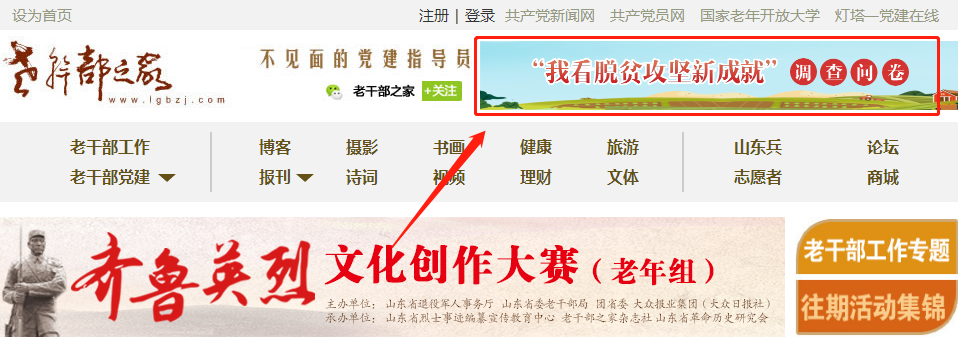 搜索进入老干部之家网官方网站,点击“我看脱贫攻坚新成就”板块即可参与填写调查问卷。