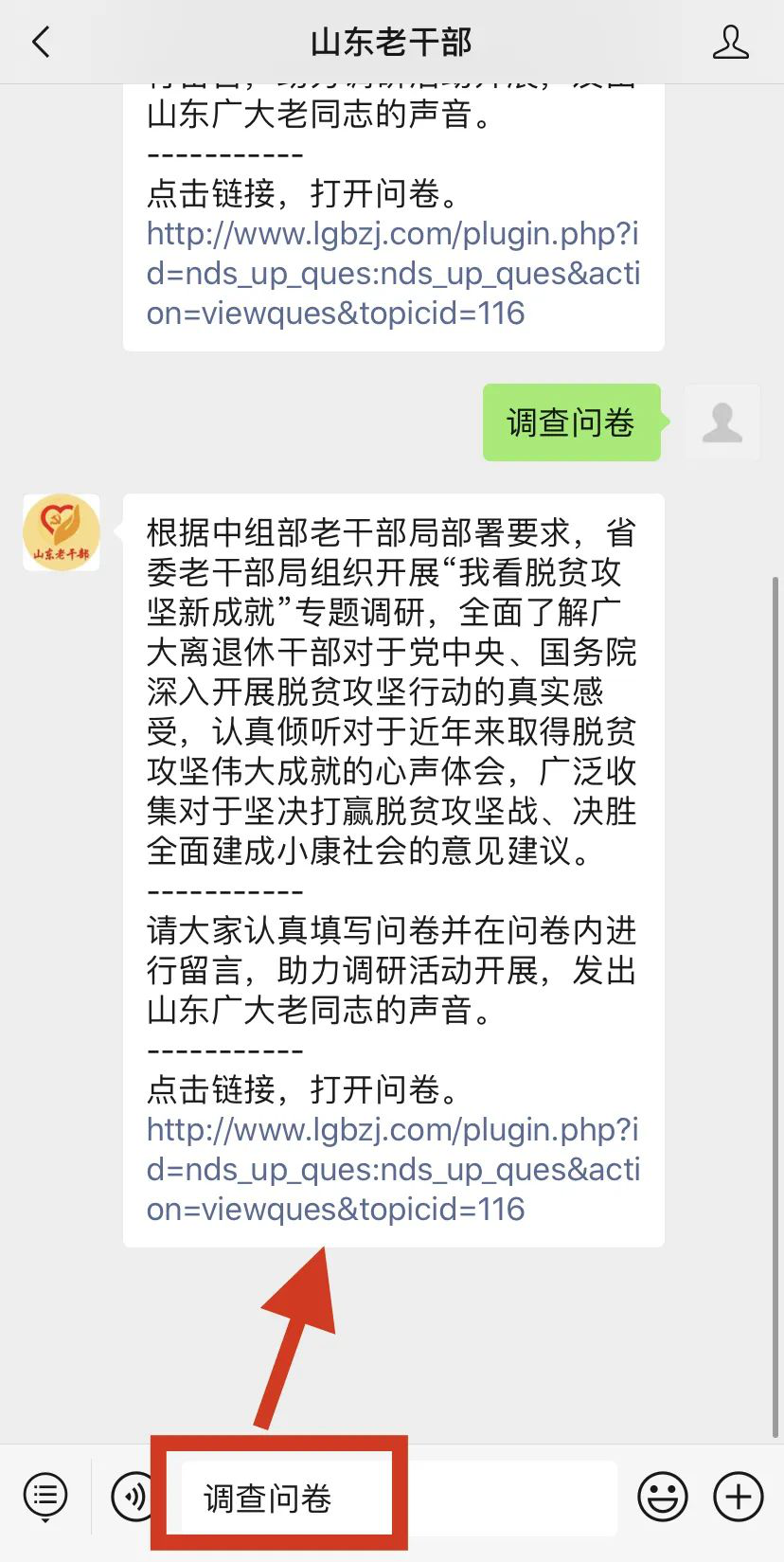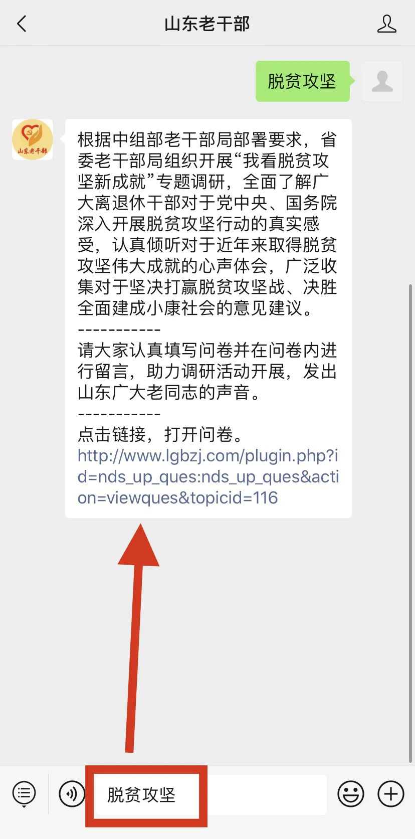 2、打开“山东老干部”微信公众号,发送关键词“调查问卷”或者“脱贫攻坚”得到自动回复,点击链接即可填写调查问卷。