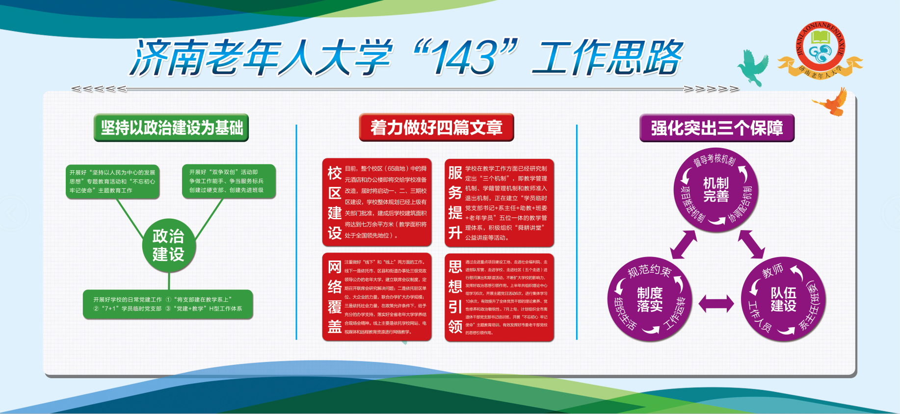 近年来,济南老年人大学通过成立学员临时党支部,创新学员党建工作新模式,组织开展多样化的党建活动,政治思想引领不断强化,党支部和党员作用发挥明显,学校的全面工作得到新提升。