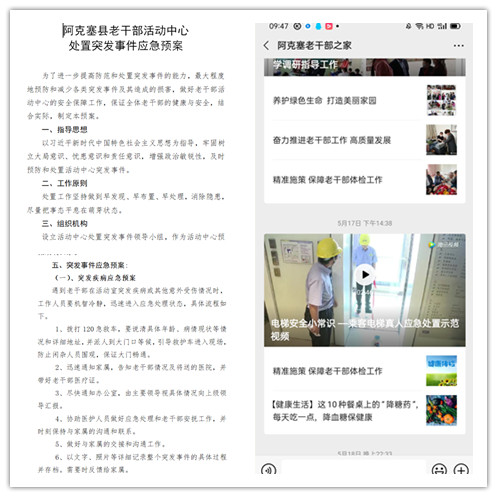为保障老干部在活动中的安全,一是根据实际情况完善了应对老干部在活动中遇到突发事件的急救方案,并组织中心工作人员根据实际情况每年一至两次进行急救预案演习。二是通过在老干部微信公众号上传电梯安全小常识示范视频等方式,向广大老干部普及电梯使用知识和安全常识,引导大家正确使用电梯,提高防范能力,减少和杜绝事故发生,使电梯成为大家出行的安全工具;通过一系列的改造升级,大大减少了活动中的安全隐患,提高了中心应对突发事件的能力,提升了创建“平安中心”的水平。