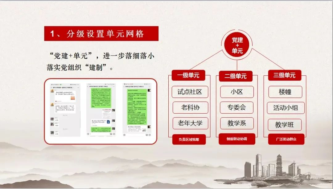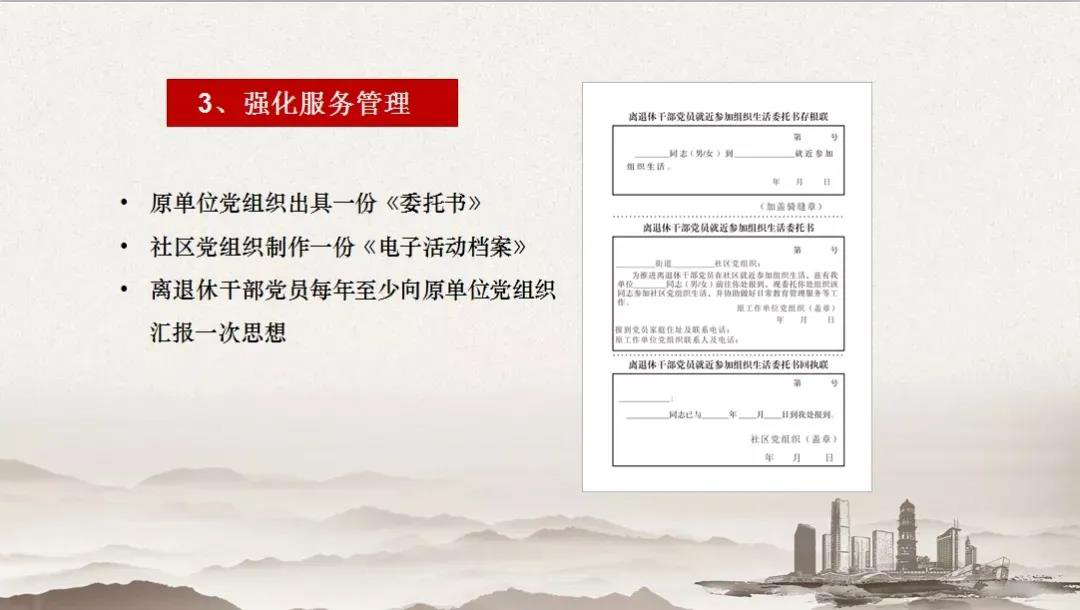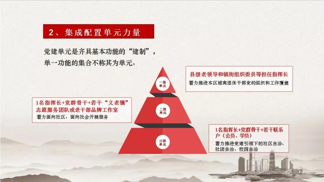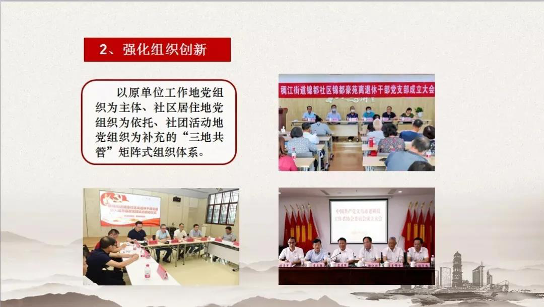 推进离退休干部党建融入城市基层党建,把原单位、涉老协会及社区各类离退休干部党组织联接整合起来,形成既区域“自转”、又互联“公转”的有机整体,把离退休干部的数量优势转化为助力基层治理的力量优势。