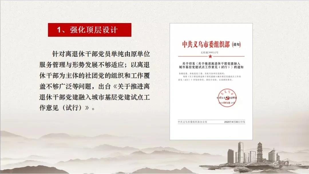 今年以来,义乌市积极推进离退休干部党建融入城市基层党建试点工作,探索构建“一名党员、三地共管,一片区域、三级共联,一个联盟、三方共建”新格局,引领离退休干部助力城市基层治理。