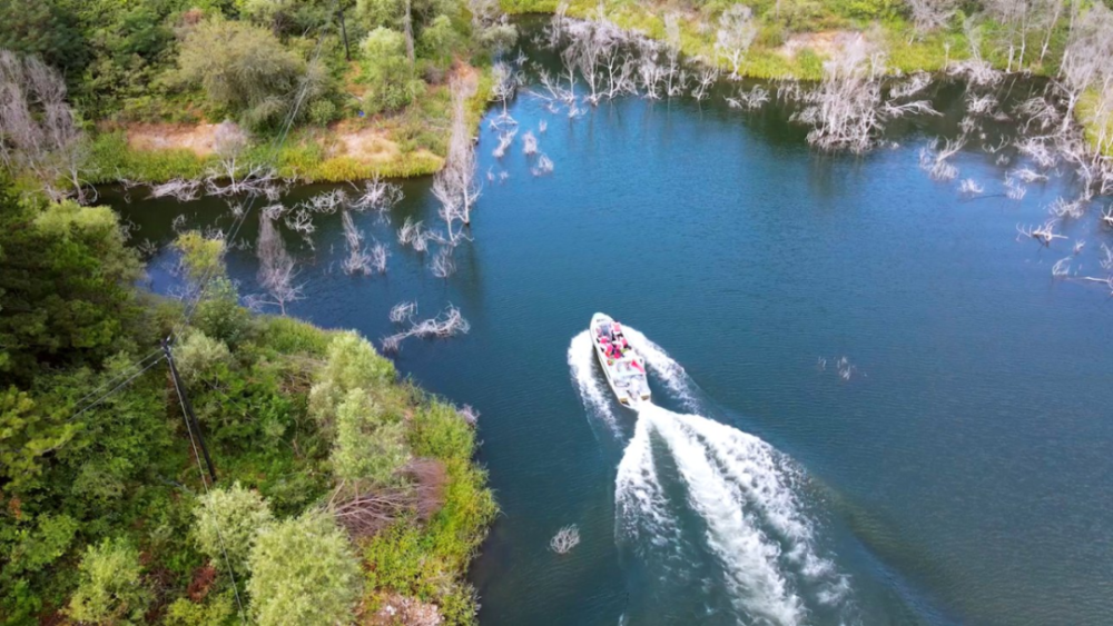 8月21日拍摄的北京市密云水库综合执法大队水上分队队员执行任务(无人机拍摄)(记者夏子麟摄)