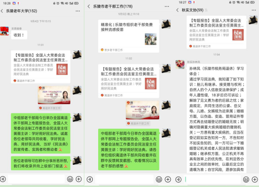 通过全市老干部工作微信群、老年大学微信群、老干部社团微信群等广泛发动离退休干部观看《学好用好民法典》专题报告会,并收集老干部感想体会。
