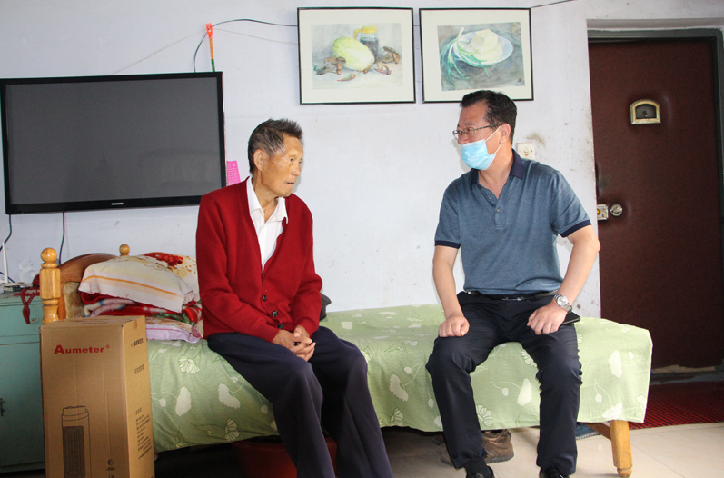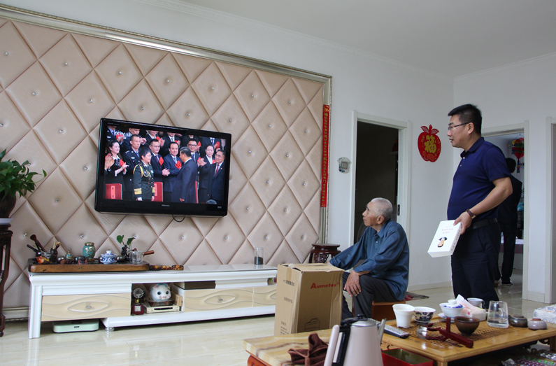 在老教师韩佰田家中,韩老正在观看全国抗击新冠肺炎疫情表彰大会,慰问组同志对韩老桑榆已晚却初心依旧、继续关心关注国家时事的精神深表敬佩,希望韩老保重身体,继续为我市教育事业和经济社会发展发挥余热。