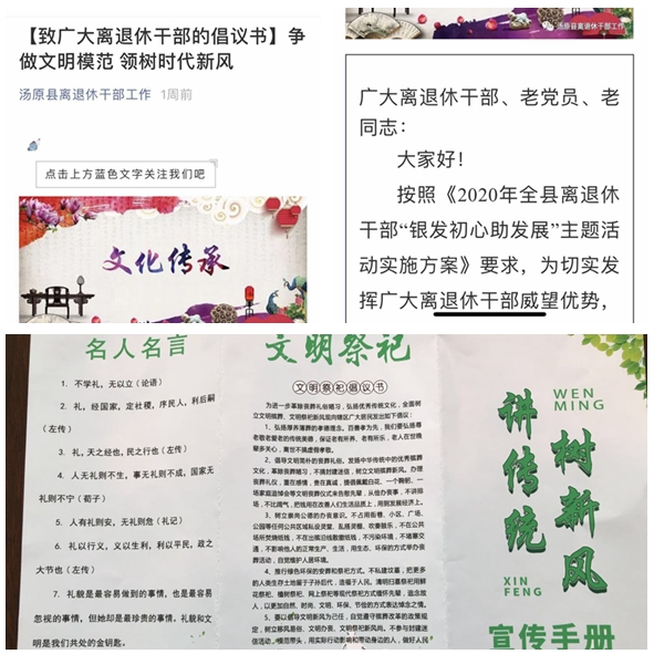 为确保宣传活动效果,汤原县委老干部局通过微信公众号向全县离退休干部发出《争做文明模范 领树时代新风》倡议书,大家纷纷通过微信工作群、朋友圈积极转发倡议书,号召老同志带头践行,在心中种下讲传统树新风的“种子”,弘扬了社会正能量。
