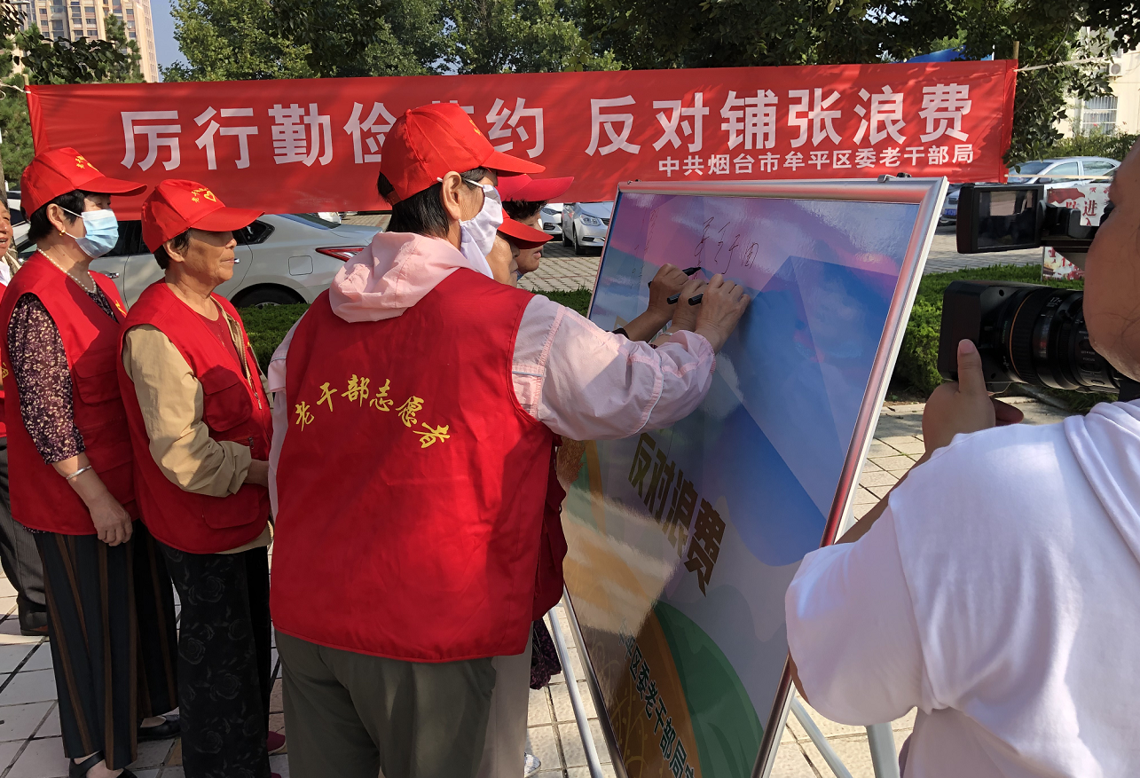 组织一次签名活动。在牟平区沁水河公园的老干部志愿服务站,老干部局组织老干部志愿者开展了一次签名活动,志愿者们纷纷在展板上签名承诺,吸引不少往来市民前来签名,同时通过向市民发放倡议书,扩大社会影响力,增强市民参与度。