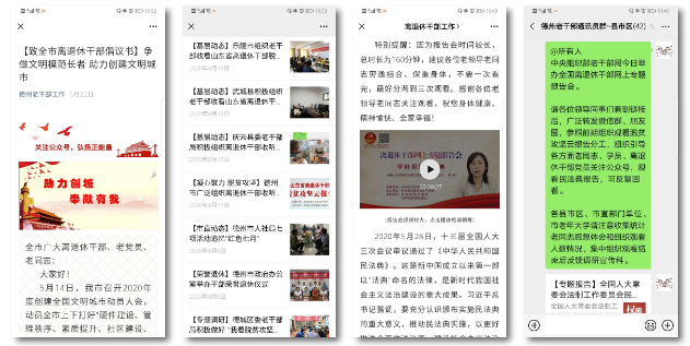 七是突出中心大局。聚焦市委确定的重点改革攻坚任务、重大改革事项,引领全体党员干部聚焦攻坚主战场,自觉站在大局中讨论问题、解决问题,今年以来,先后围绕创建全国文明城市、学用民法典、节能宣传周、厉行勤俭节约等方面开展了专题学习培训。同时,积极组织广大老同志围绕中心、服务大局,通过在官方网站、微信公众号、老干部APP开辟专题专栏等方式,组织老同志学网用网,在网络发声点赞,为经济社会发展建言献策,努力把老干部工作与全市中心工作、重点工作联系起来,做到市委有部署、组织有行动、党员有作为。今年以来,先后组织老同志开展了“我看脱贫攻坚新成就”专题调研,组织全市老同志在线观看了“我看脱贫攻坚新成就”“学好用好民法典”专题报告,引导老同志为坚决打赢脱贫攻坚战、全面建成小康社会凝聚思想共识、汇集桑榆力量。