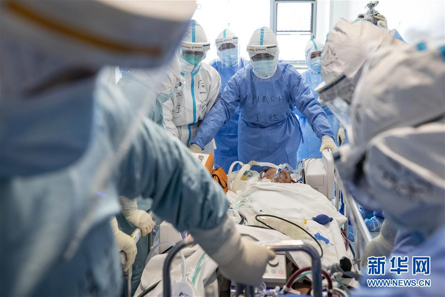 北京协和医院医疗队队员与武汉同济医院医务人员共同将一名新冠肺炎危重症患者转往武汉同济医院中法新城院区ICU。在转运过程中,ECMO(人工膜肺)治疗仍在持续进行(4月12日摄)。 新华社记者 沈伯韩 摄