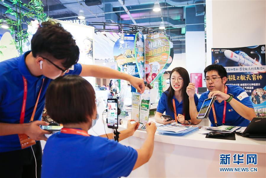 在服贸会旅游服务专题展区,中国旅游集团展位的工作人员通过直播向线上观众介绍旅游服务产品(9月5日摄)。 新华社记者 潘思危 摄