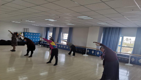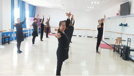 教学以民族舞为主,课程从基本功、基本手势动作等简便易学的舞蹈动作开始,练习中采用快慢结合,逐步到完整的动作示范和轻快的音乐练习。活动室内,学员们学习热情浓厚,舞蹈动作整齐划一。