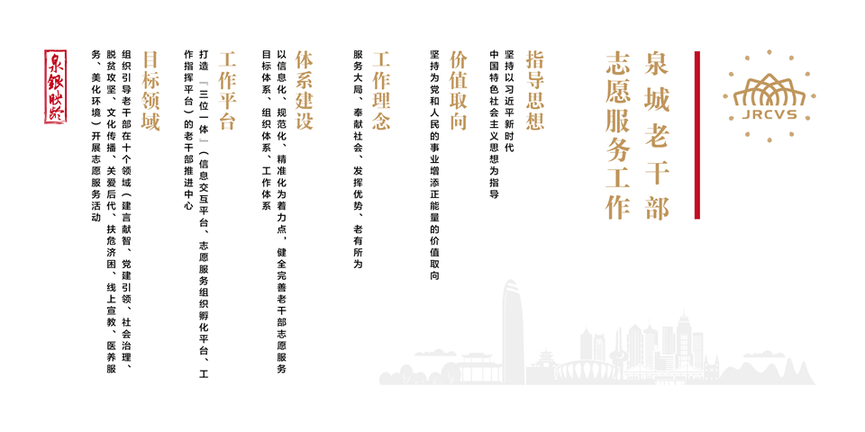 明确服务理念和服务领域。针对广大离退休干部的特点,以为党和人民的事业增添正能量为价值取向。确立“服务大局、奉献社会、发挥优势、老有所为”作为泉城老干部志愿服务工作始终秉承的理念,引导老干部在建言献智、党建引领、社会治理、脱贫攻坚、文化传播、关爱后代、扶危济困、线上宣教、医养服务、美化环境等十个领域开展志愿服务活动。