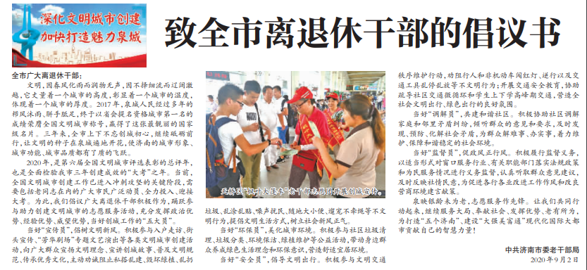 三是在全国文明城市创建工作进入冲刺攻坚的关键阶段,开展了“泉映银龄·助力创建文明城市”主题志愿服务活动。通过《济南日报》向全市离退休干部发出倡议,号召老同志充分发挥政治优势、经验优势、威望优势,在改善城市形象、提升城市品质、完善城市功能、提高全社会文明素养等方面开展志愿服务活动,当好宣传员、环保员、安全员、调解员、监督员。广大老同志热情响应,积极投身各项志愿服务活动,以实际行动助力省会建设。