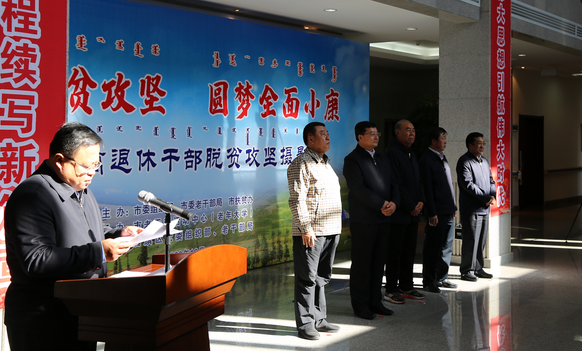 10月16日,在全国第七个扶贫日到来之际,由市委组织部、市委老干部局、市扶贫办主办的“决胜脱贫攻坚 圆梦全面小康——内蒙古鄂尔多斯市离退休干部脱贫攻坚摄影展”在康巴什区市老干部活动中心(老年大学)正式开展。市委常委、组织部部长刘瑞杰出席活动并宣布开展,市委组织部副部长、老干部局局长杨卫东致辞,市委组织部副部长张鹏程主持开展式,市政协原主席王德宝、市人民政府原巡视员袁庆中以及市扶贫办主任陈德华出席开展活动。