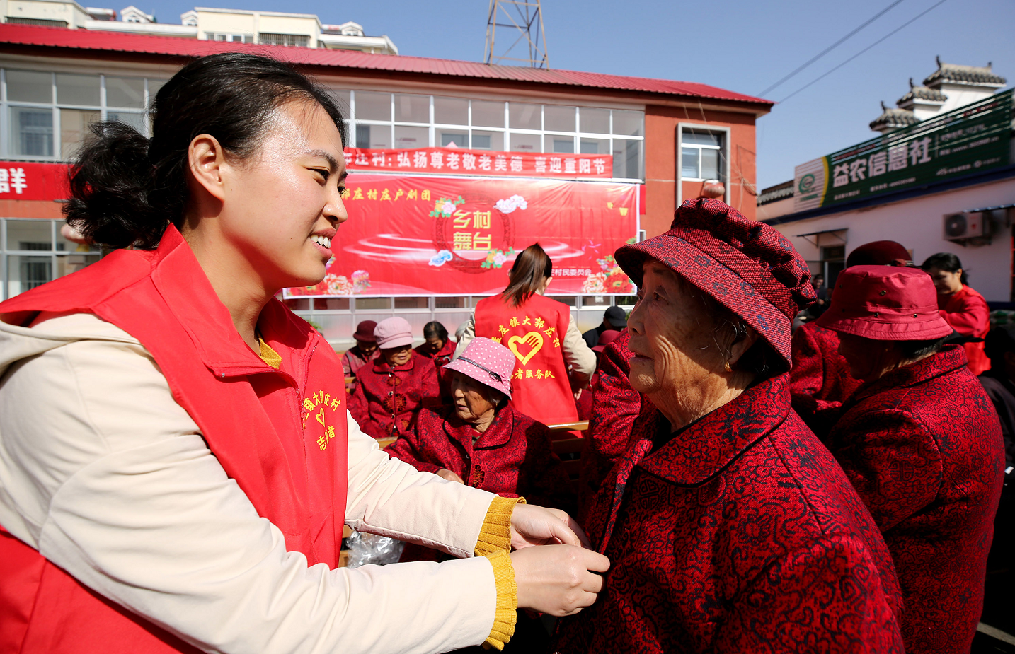 (图1)10月22日,在山东省枣庄市市中区孟庄镇大郭庄村,志愿者在为老年人试穿购买的新衣服。