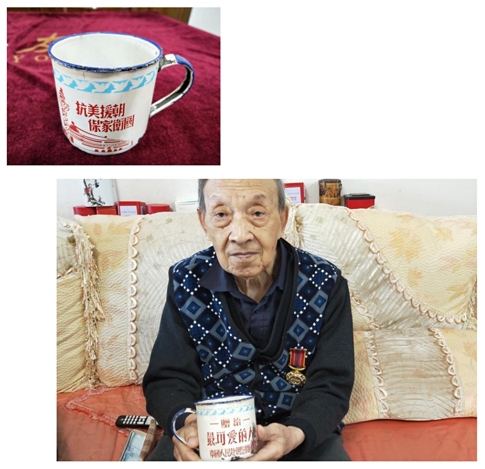 在陶占奎老同志家中,慰问组的同志看到了他保留下来的抗美援朝战争胜利时留下的“献给最可爱的人”纪念茶缸。70年过去了,茶缸依然保存完好,深深地留下了历史的印迹和英雄的足迹。