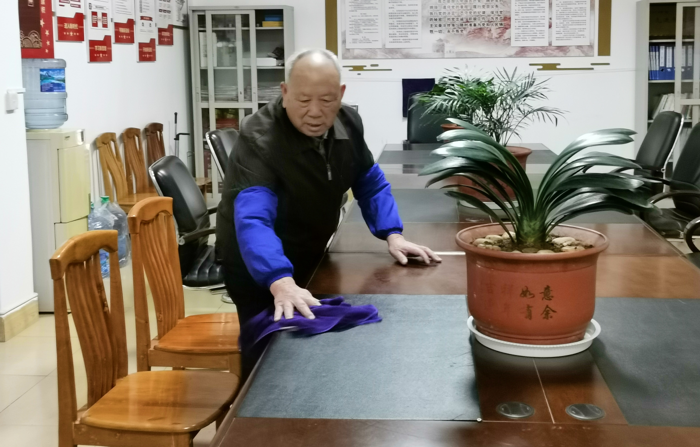 多年来,老贾坚持义务打扫活动室环境卫生,养护绿色植物。虽然他不是党支部的支委,也不是支部书记和副书记,但他主动承担起党支部的党建工作,有了他的各种帮助和配合下,他所在的党支部多次受到中院机关党委的表扬和肯定。