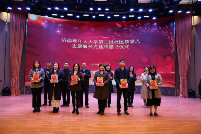 节目过后,邀请第一批社区教学点和志愿服务点代表——市中区杆石桥街道乐山小区社区综合党委书记谭欣发言;市委老干部局副局长、济南老年人大学校长温洪军宣布了第二批社区教学点和志愿服务点名单;与会领导为第二批社区教学点、志愿服务点挂牌赠书;市委组织部副部长、老干部局局长苏本宽作了总结讲话。仪式在舞蹈《我和我的祖国》的优美旋律中结束。