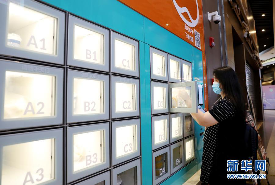 一位顾客通过APP扫码,在上海地铁13号线世博会博物馆地铁站附近的一家盒小马服务点取餐柜中拿取预定的早餐(7月17日摄)。新华社记者 方喆 摄