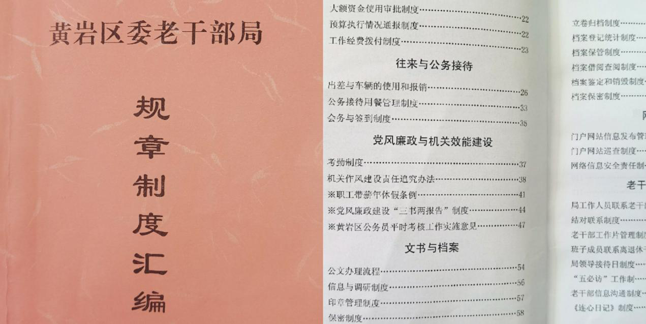 将制度的完善作为“清廉机关”建设的突出问题加以重视。一方面细化完善了物资采购、财务报销等规章制度,规范了项目经费预审和决算、重大物资采购专项监督、重大项目进展情况通报等工作机制,进一步加强财务监管,堵塞廉政漏洞。另一方面,加强钉钉考勤、请销假管理,细化中层干部廉政谈话制度,在老干部局机关营造“尊重规矩,严守纪律”的工作氛围。同时,还聘请法律顾问,对编外用工管理、国有资产出租、违规责任追究等方面进行了规范,解决了巡察要求整改的国有房产出租管理严重缺位问题。