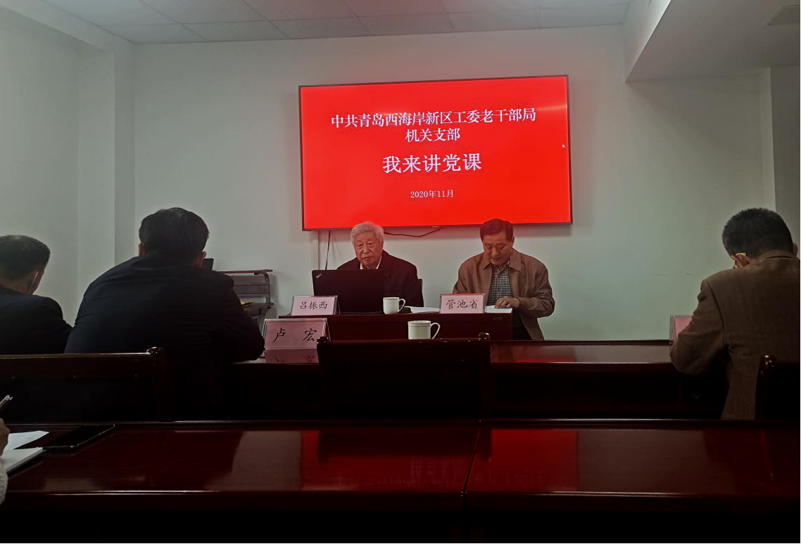 2020年11月11日下午,青岛西海岸新区工委老干部局立足部门优势、依托老干部资源开展“我来讲党课”活动。聘请原青岛经济技术开发区工委宣传部副部长、现新区老年大学党委委员、校委会副主任为全体党员上党课。吕振西同志已经退休多年,但依然无私奉献在新区的老年教育战线上,为新区老年教育发展做出了突出贡献。曾荣获青岛市老年大学系统风范长者、新区老年大学老年教育功臣、青岛市离退休干部十佳文化骨干等称号。