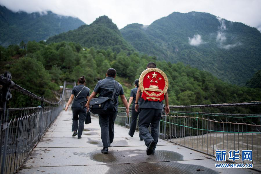 云南省怒江傈僳族自治州贡山县人民法院法官邓兴背着国徽与同事们跨过怒江(2019年8月30日摄)。为方便居住在高山峡谷里的农村群众,邓兴和同事们一起背着国徽,组建巡回法庭。每年足迹遍及50多个村镇,行程近万公里。新华社记者 江文耀 摄