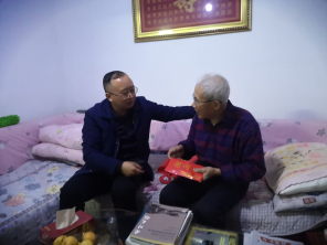 图为重庆市南川区委组织部副部长、老干部局局长张华洋为离休干部汪洪章送学习资料和慰问金。