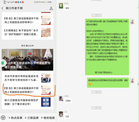 一是全面部署。银川市高度重视,迅速发文通知,要求各县(市)区离退休干部党工委、中心、大学、市直部门各党支部切实把此次活动作为离退休干部党员学习教育的重要内容,认真组织离退休干部党支部、离退休干部收看专题报告会。并通过微信公众号宣传,老年大学班级群、离退休党支部书记微信群在线通知等,确保网上专题报告会前期宣传通知全覆盖,引导老同志收看报告会、深入学习党的十九届五中全会辅导报告。