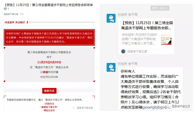会前,冠县老干部局通过“冠县老干部之家”微信公众号和“全县离退休干部工作者群”对广大老同志传达了通知精神,根据冠县离退休干部实际情况,采取集中学习和自学的形式学习了专题报告会。