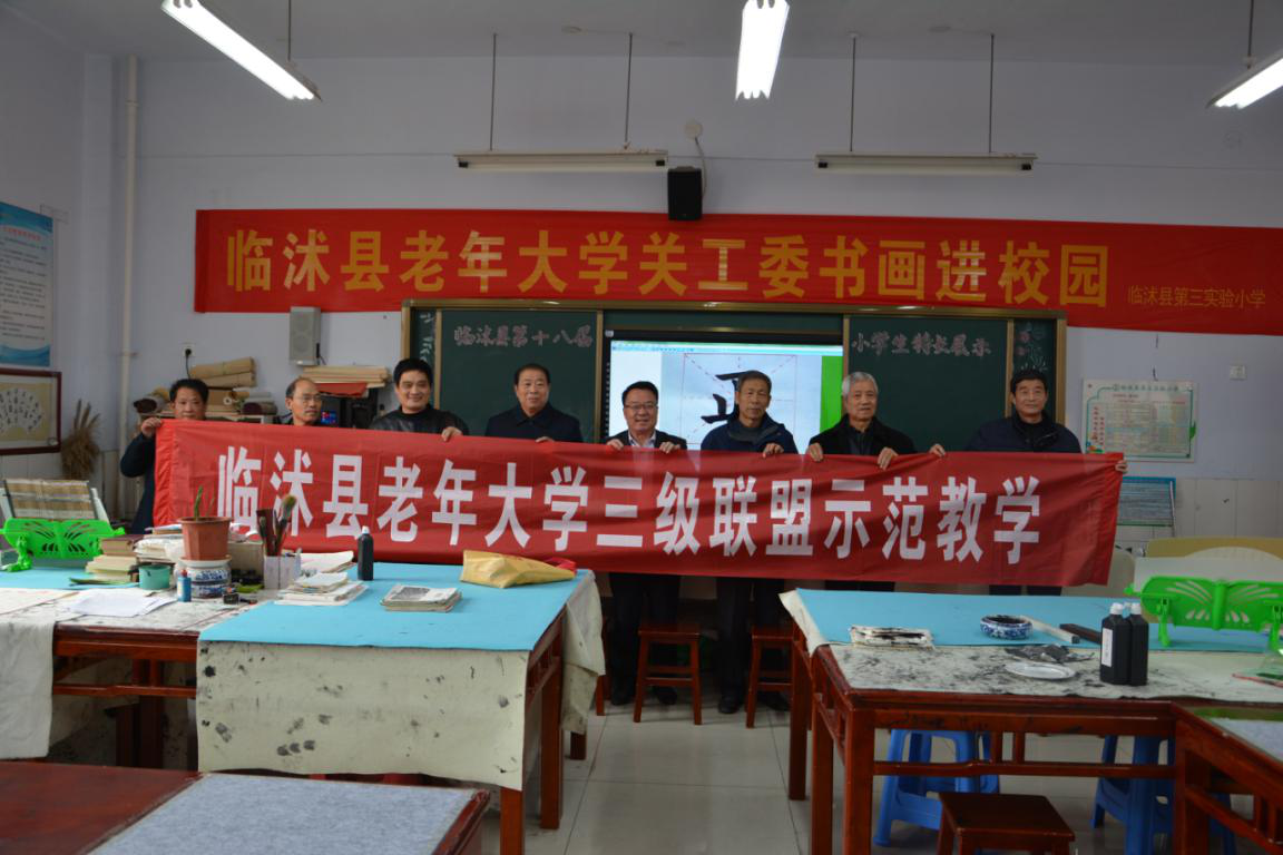11月14日,临沂临沭县老年大学三级联盟示范教学走进县第三实验小学,开展书画进校园活动,受到在校师生的热烈欢迎。