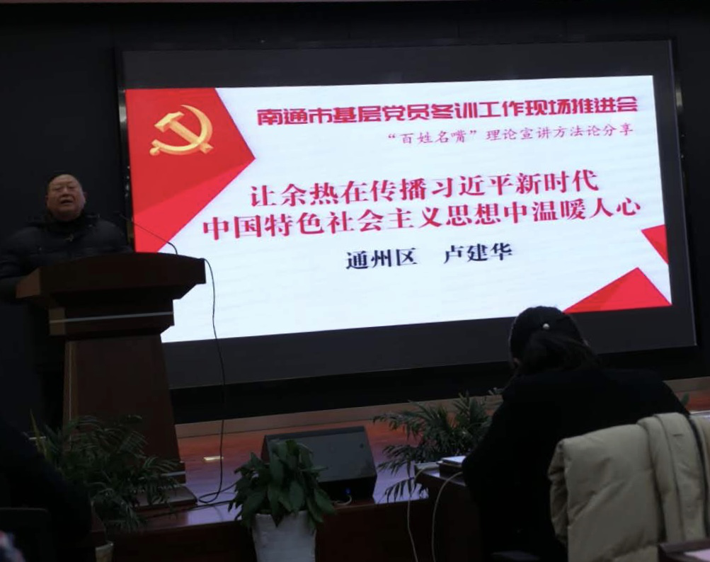 卢建华从通州区国土局退休后,回到家乡石港镇四港村,积极参与村党组织的活动,每年自掏腰包,从退休工资中挤出一笔费用用于各类宣讲活动。2017年12月,区首家“党的创新理论传习所”在石港镇四港村正式成立,十九大代表、省纪委副书记、监察厅厅长王立平莅临现场揭牌。卢建华担任传习所的义务教员,利用周边群众的农闲时间宣讲党的最新理论。“我把村民百姓最关心的问题拎出来,结合农村实际,让他们一听就懂。”卢建华说,为了讲好每堂宣讲课,他像教师备课一样,认真查阅资料、斟酌字句,力求用通俗的语言、生动的形式,准确传达十九大精神,“村民们能不能在思想上跟上‘新时代’,就看我们讲得好不好”。三年来,他大大小小一共宣讲了几十场,人民网、新华日报等作了专题报导。